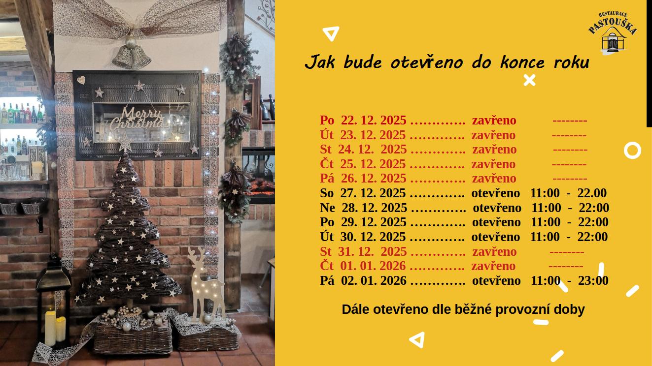 Od 22.12. do 26.12.2025 bude restaurace PASTOUŠKA zavřena.